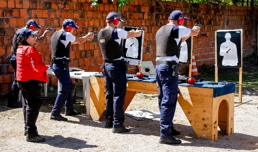 Além das armas longas, os futuros policiais também aprendem a operar revólver calibre 38 e pistolas calibre 40. Durante as 54 horas/ aulas da disciplina, os alunos participam de oficinas que funcionam na forma de circuito.