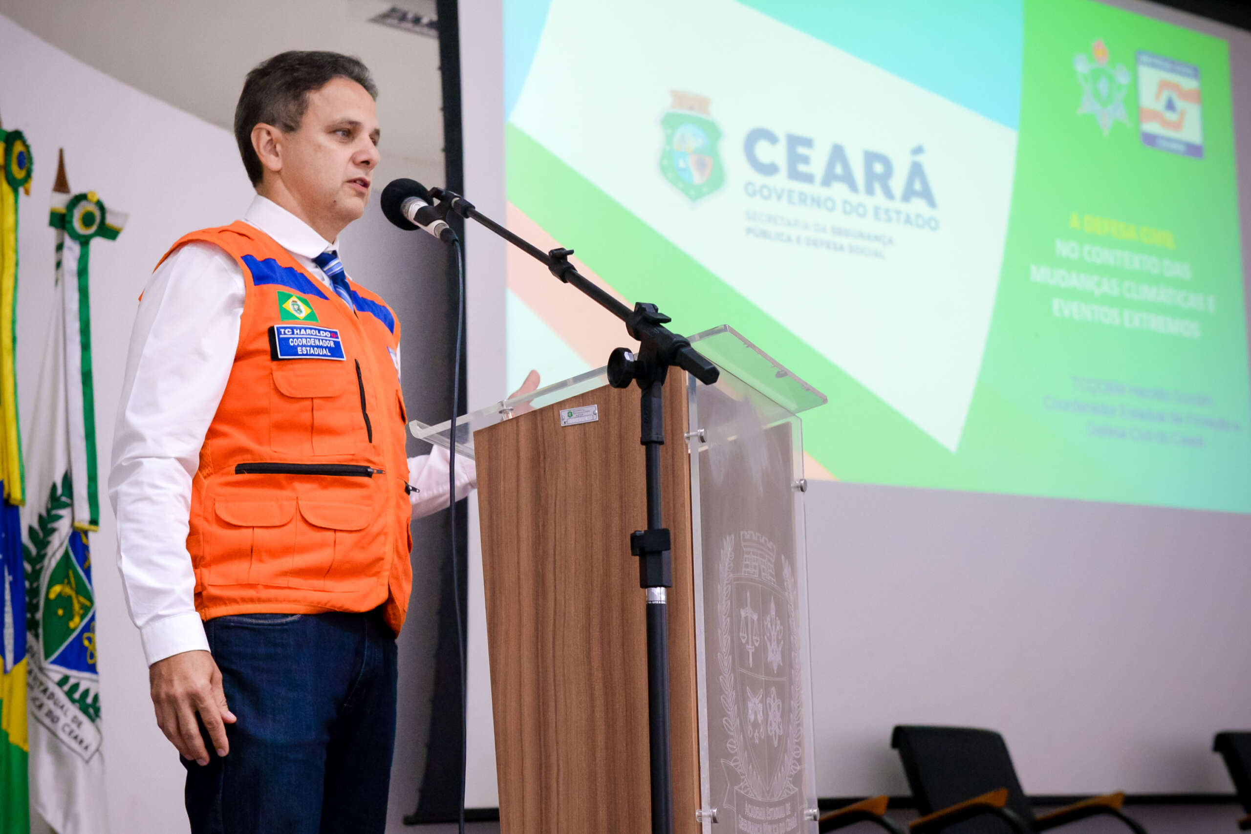 Durante a aula inaugural, o Coordenador Estadual de Defesa Civil, Tenente Coronel Haroldo Gondim, proferiu a palestra “A Defesa Civil do Ceará no Contexto das Mudanças Climáticas”, destacando a relevância do tema diante dos eventos extremos e naturais crescentes no país. “Hoje nós estamos vendo um país com diversas ocorrências. Em 2023 foi o ano com o maior evento, adversos extremos, eventos naturais. Mais de mil, mais de três por dia”, ressaltou o tenente coronel Gondim.