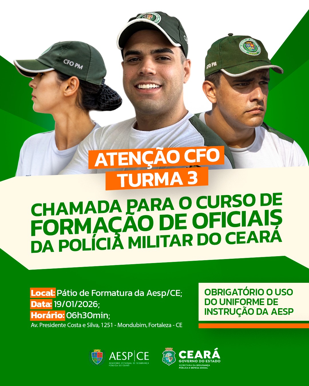 A Academia Estadual de Segurança Pública do Ceará (Aesp/CE), em conjunto com a Polícia Militar do Ceará (PMCE), convoca os cadetes admitidos no concurso público para o cargo de 2º Tenente da Polícia Militar do Estado do Ceará, Turma III, conforme o Edital nº 035/2024 e devidamente matriculados no Curso de Formação de Oficiais (CFO) para o início das aulas.