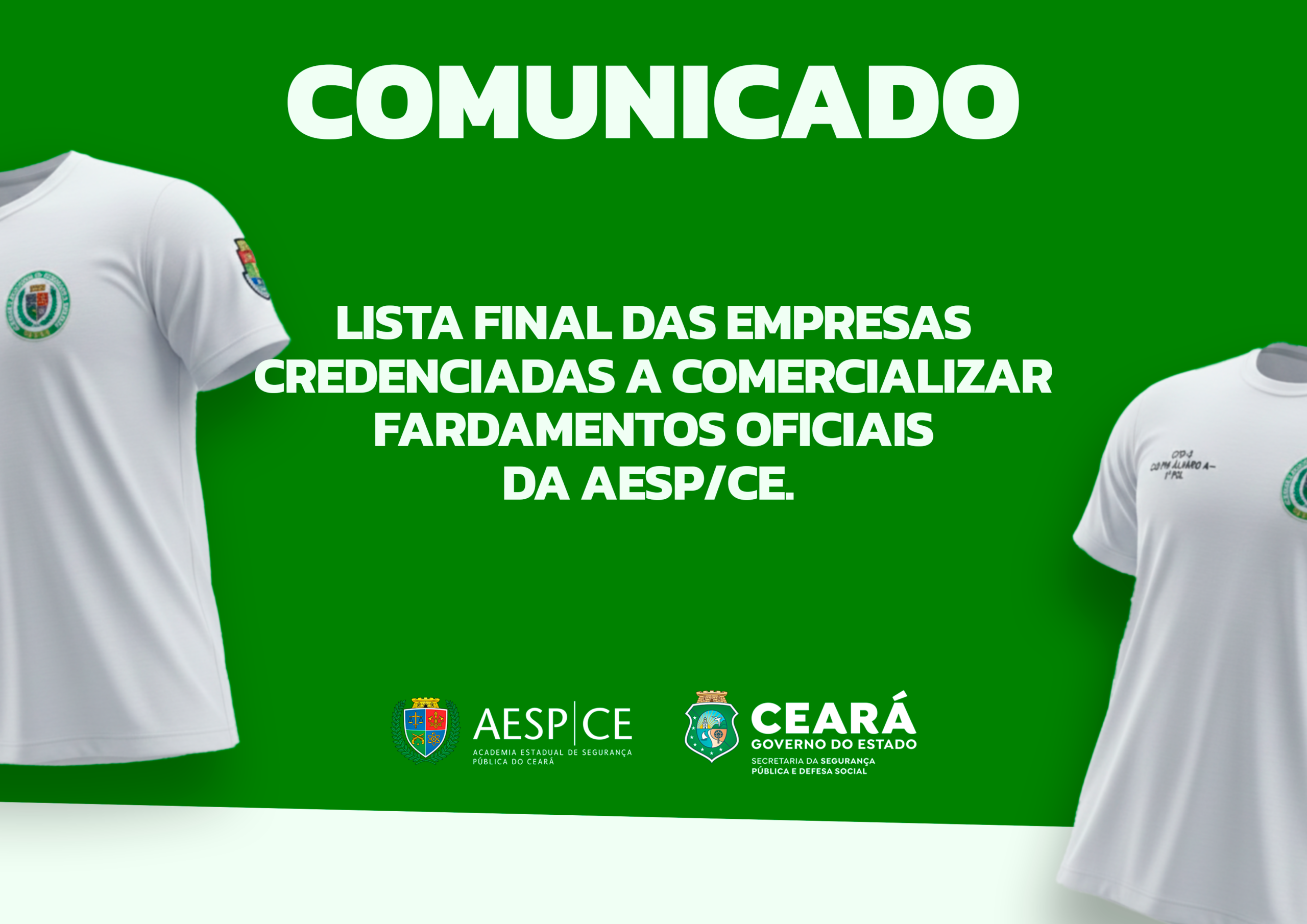 A Academia Estadual de Segurança Pública do Ceará (Aesp/CE) divulga o resultado final do Edital de Chamamento Público nº 01/2025, que ocorreu entre 12 de janeiro de 2026 e 13 de fevereiro de 2026, para credenciamento e revalidação de empresas responsáveis pela confecção e comercialização dos uniformes oficiais utilizados nos cursos de formação.